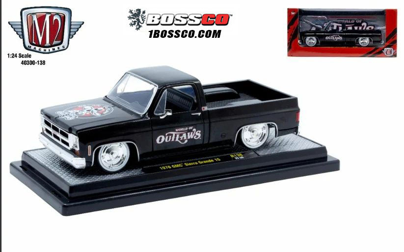 This M2, 1/24 1976 GMC Sierra Grande 15 "World of Outlaw"  Truck is finished in Gloss Black with World of Outlaw Graphics. Includes Custom Wheels with Rubber Tires.